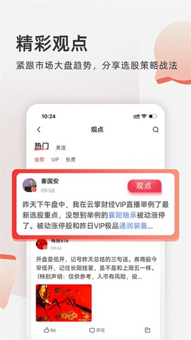 2. 【特色模块】:包括精彩观点、私密圈子和视频直播。精彩观点模块每日更新股市趋势解析与选股策略;私密圈子促进达人与用户之间的深度交流;视频直播覆盖盘前、盘中与盘后内容,指导用户把握投资时机。
