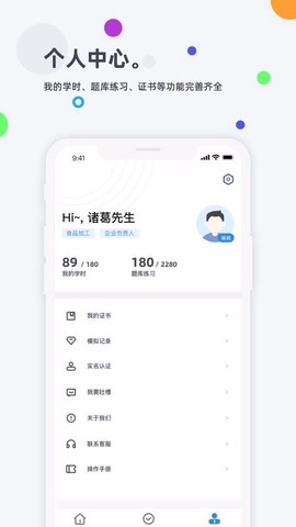 6、最后的“个人中心”就是你的属性面板,你的学时、练习进度、获得的“成就证书”都在这里展示,满满的成就感!