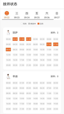 1、动态技师状态看板实时显示服务人员的工作状态,包括服务中、待命、休假等不同状态标识,支持按技能等级筛选,便于快速分派订单。