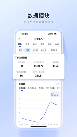 实时经营数据分析一目了然,涵盖订单、流量、物流、顾客评价及售后等关键指标,帮助你精准判断市场趋势,制定毫无违和感的营销策略,做到心中有数。
