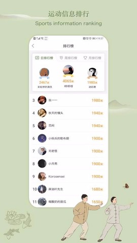 5、运动信息统计系统自动生成行走里程数据,并提供日、周、月三类排行榜单;